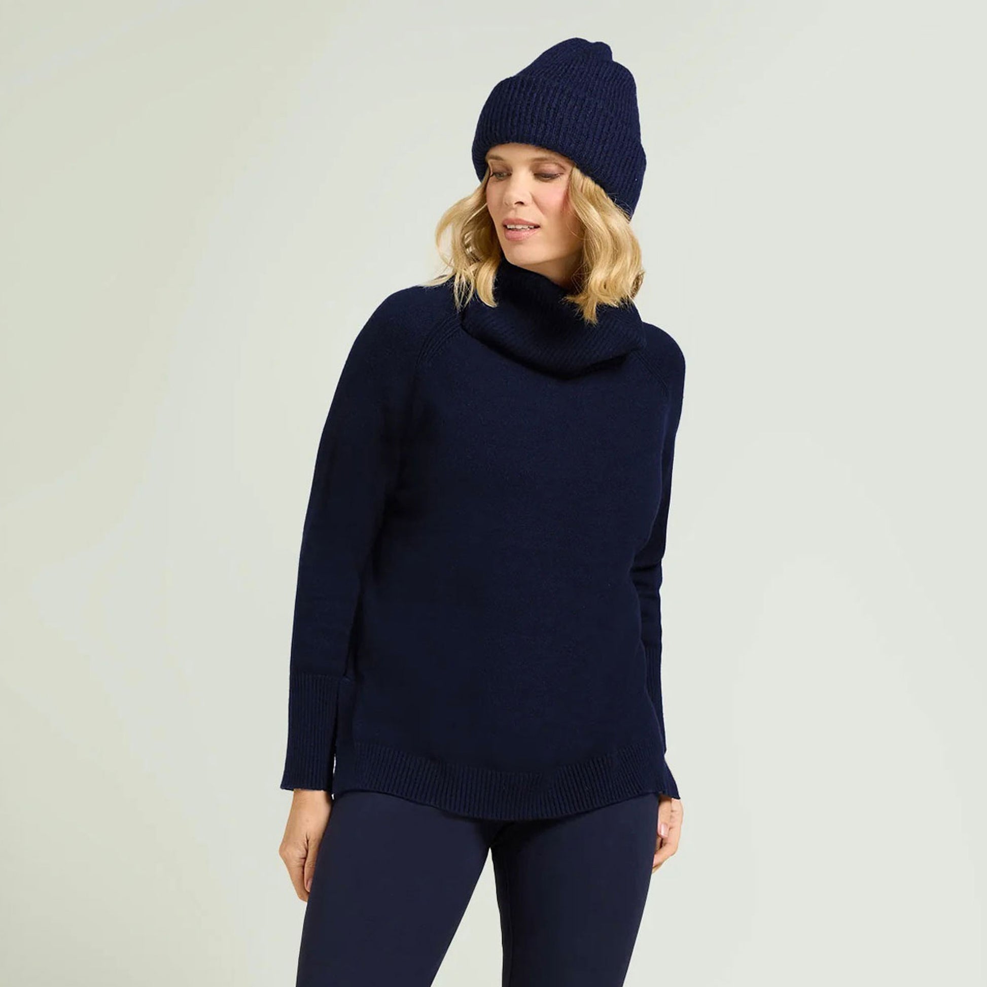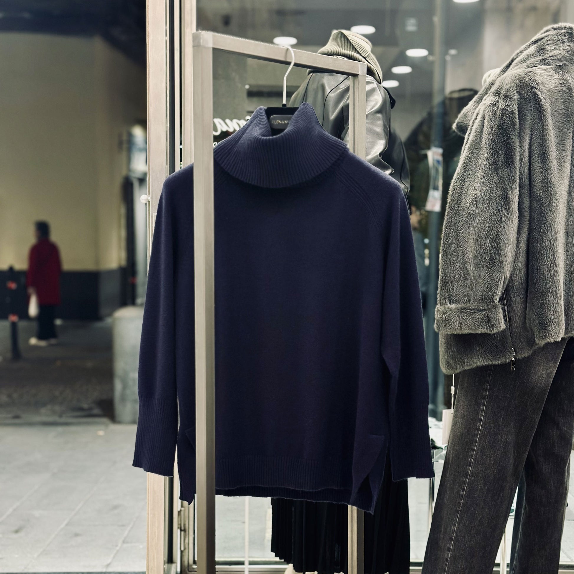 Maglia in viscosa comfort dalla linea comoda con spacchi laterali sovrapposti. Punto rasato in finezza 7 con bordi in costa, taglio raglan con calature, scollatura rotonda e collo ad anello staccabile. Disponibile in nero e in un donante punto di azzurro, perfetto con il jeans.