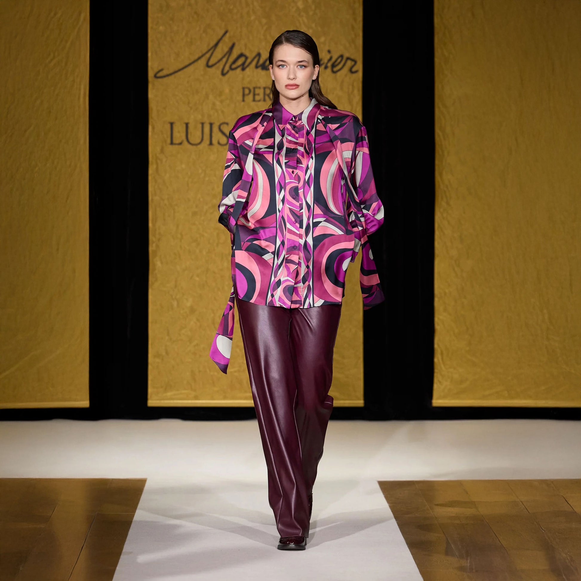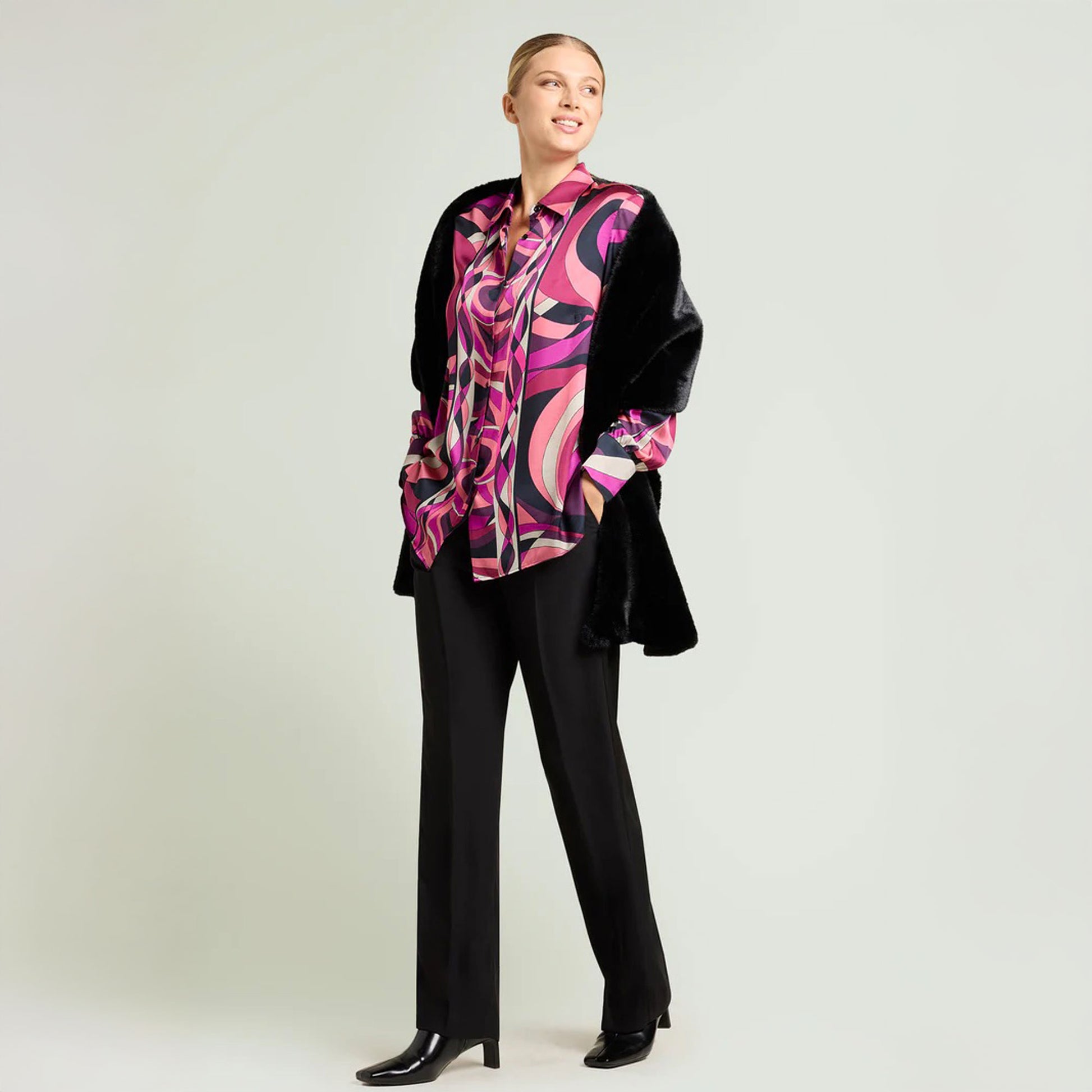 Tocchi di rosa, fucsia, porpora e burgundy illuminati dall'avorio e da pennellate di nero. Un capo esclusivo della collezione "Mara Venier per Luisa Viola".