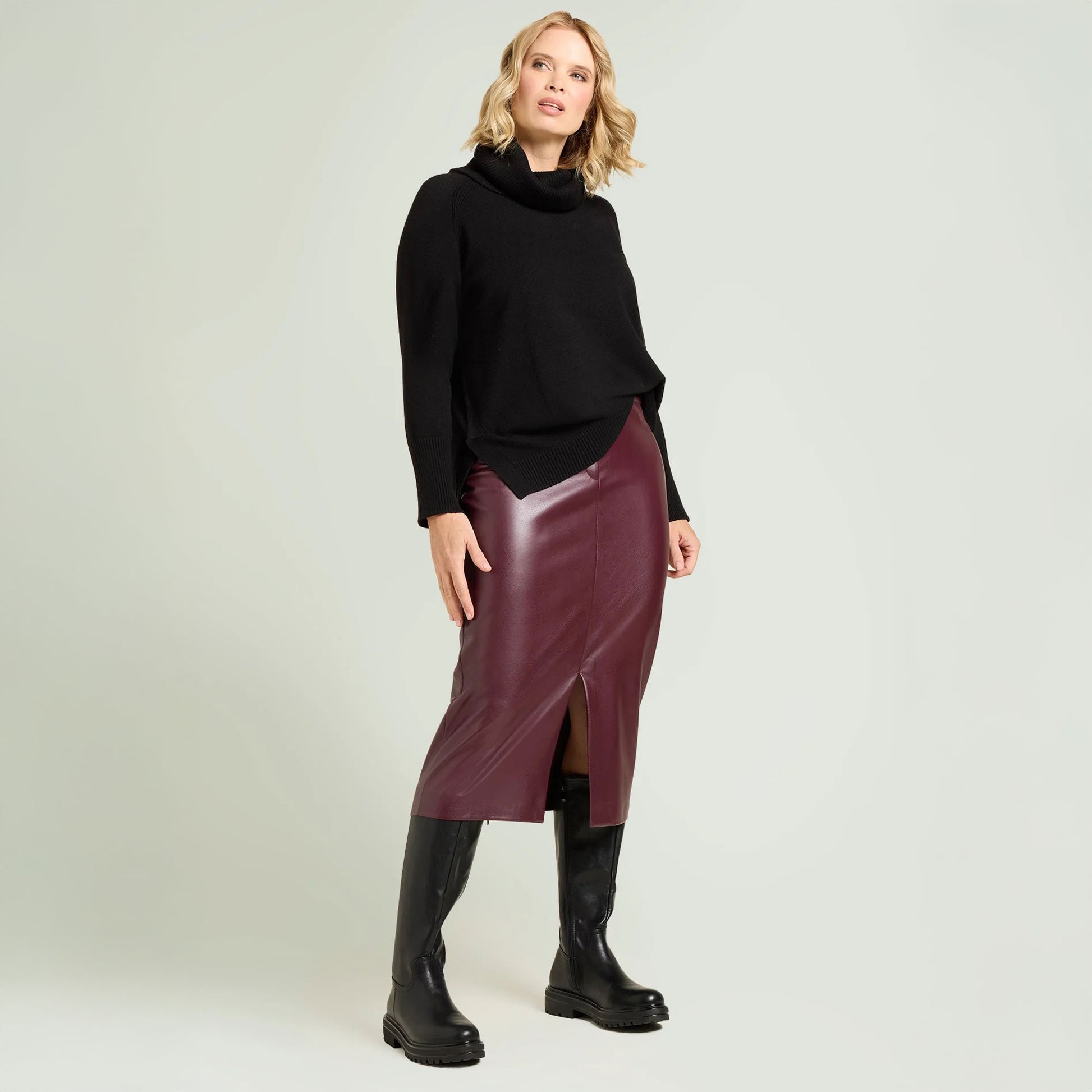 Gonna realizzata in un morbido tessuto spalmato con interno scamosciato. Linea dritta con spacco su centro davanti. Cinturino con lavorazione estensibile, chiusura davanti con zip nascosta e bottone, sfoderata.