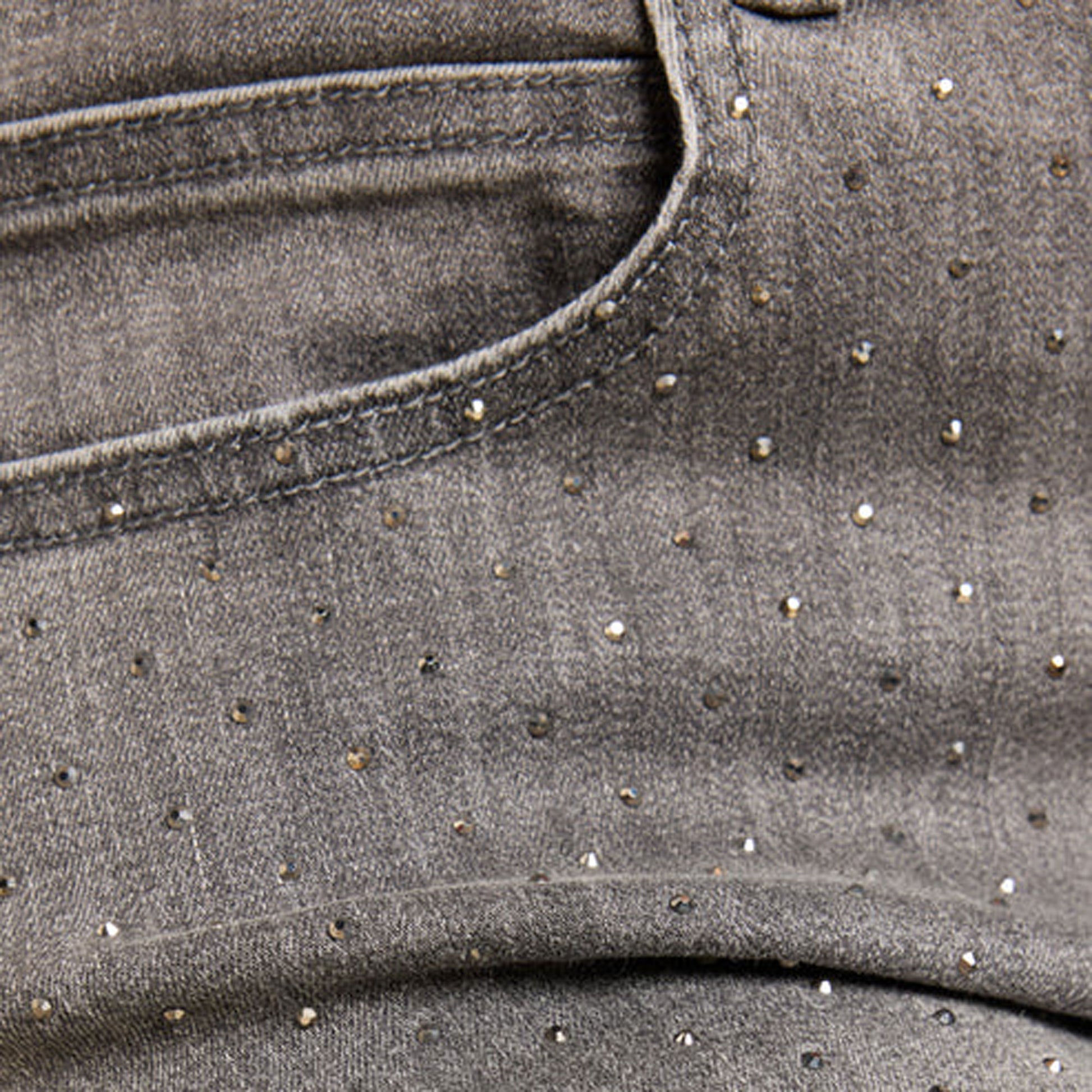 Pantaloni cinque tasche in Denim stretch (9,5 once) dalla linea Skinny, impreziosito sul davanti da una pioggia di micro-borchiette sfaccettate. Punto vita leggermente abbassato, cintura in forma con lavorazione estensibile e passanti, chiusura davanti con zip nascosta e bottone, dietro con baschina push-up. Trattamento stone washed con sabbiature, impunture in tinta. Bottone e rivetti gunmetal con il logo "V" di Luisa Viola.