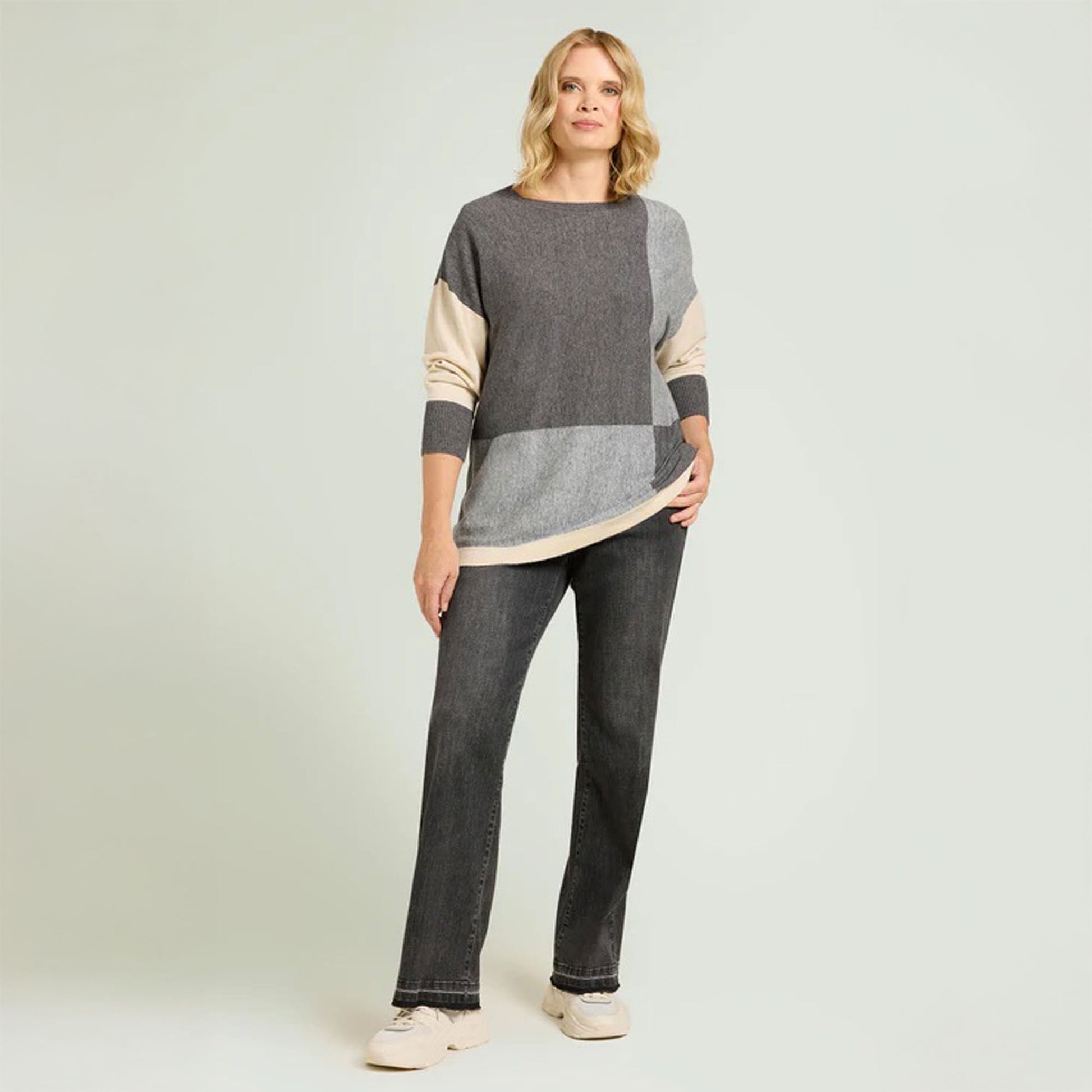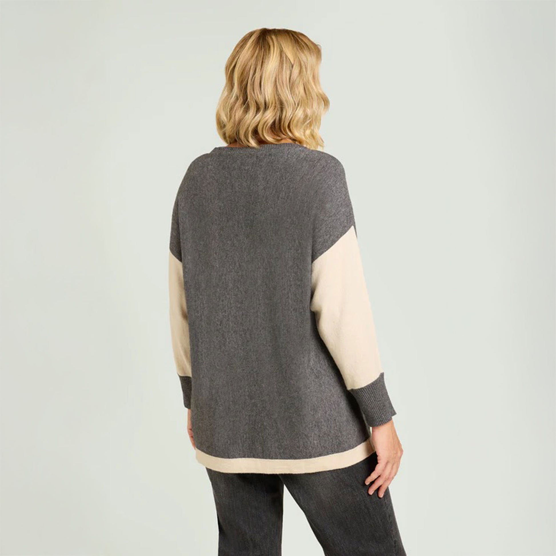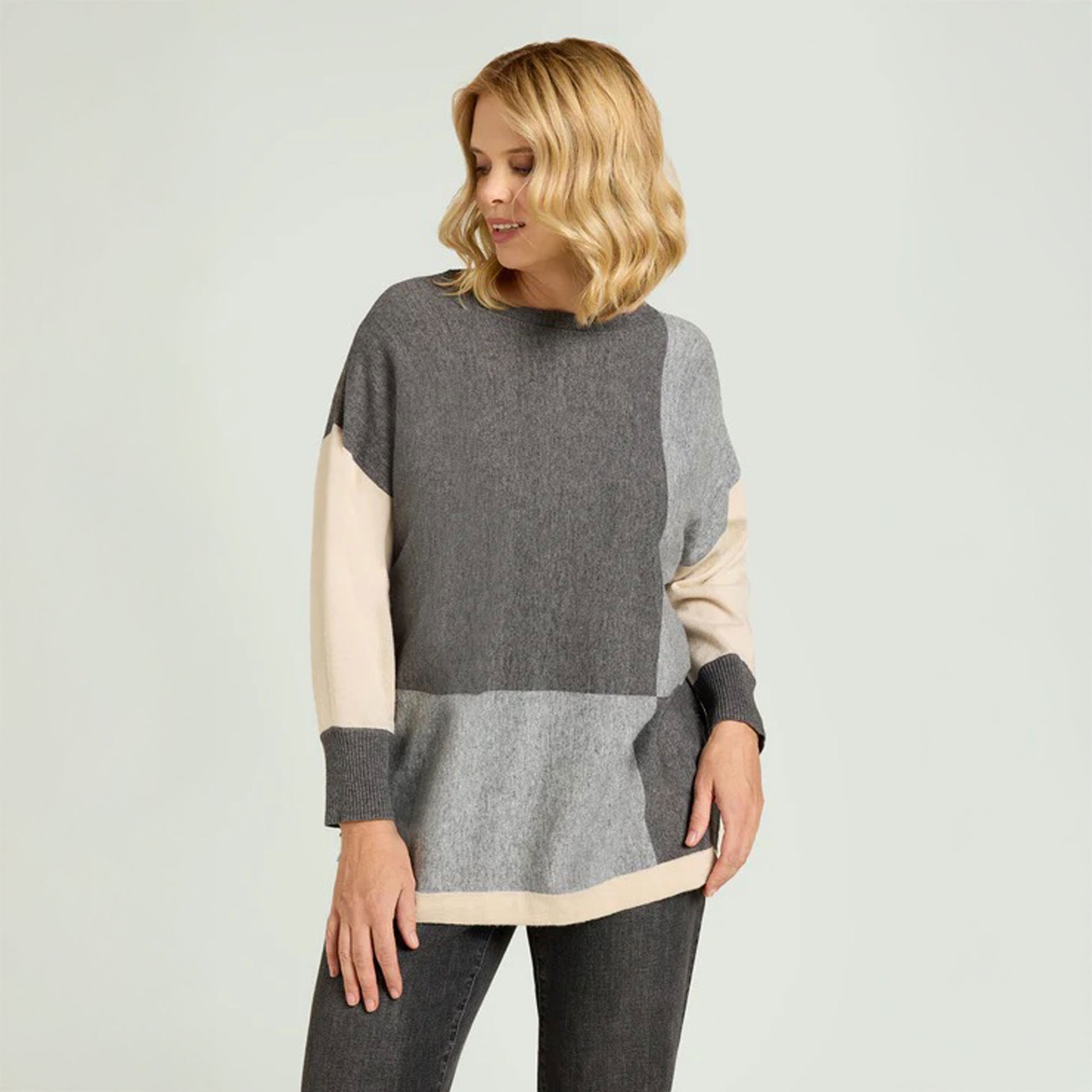 Maglia in filato misto cashmere con blocchi di colore in due tonalità di grigio melange e tocchi di color sabbia. Filato misto cashemire, finezza 12, punto rasato con polsi in costa. Taglio chimono con intarsio.
