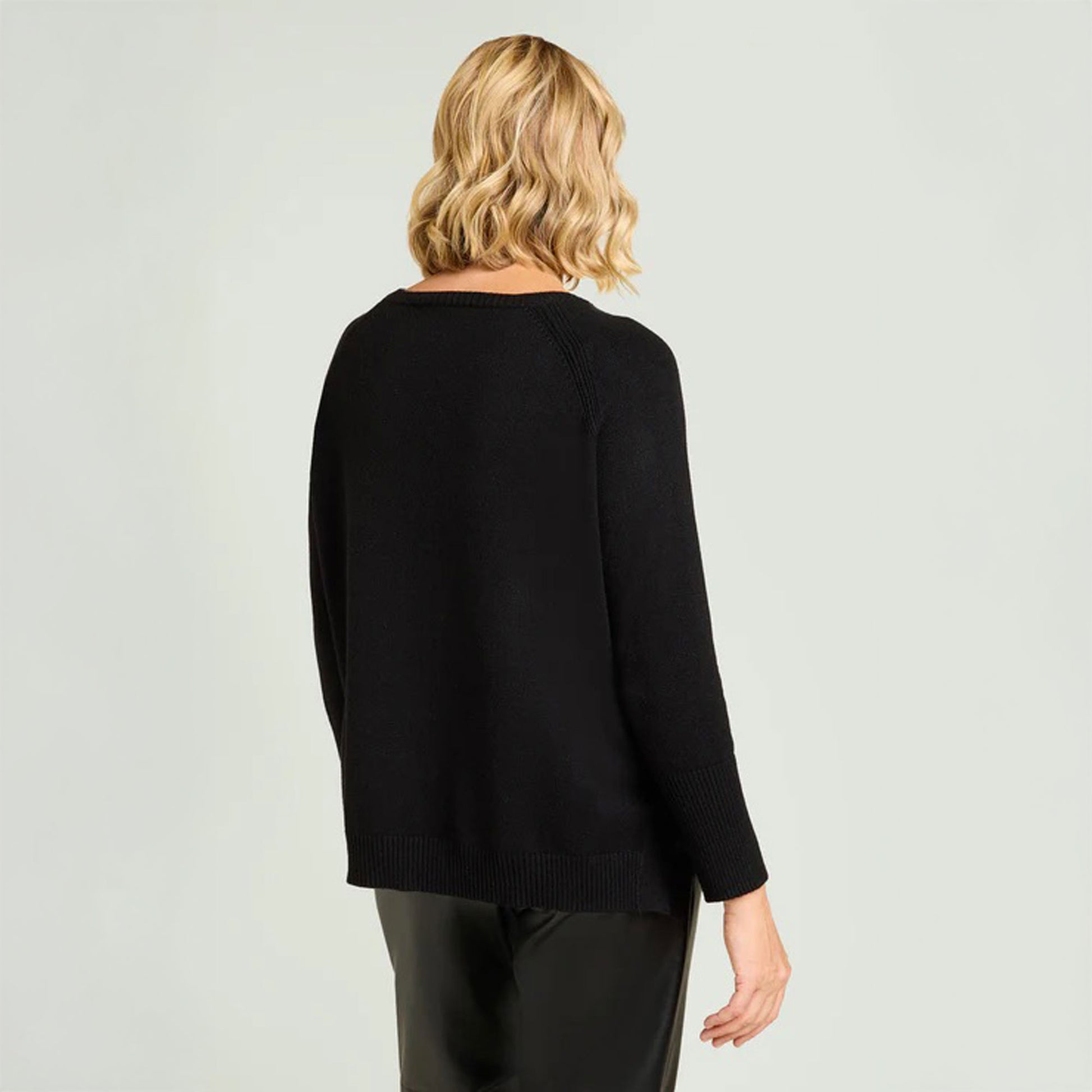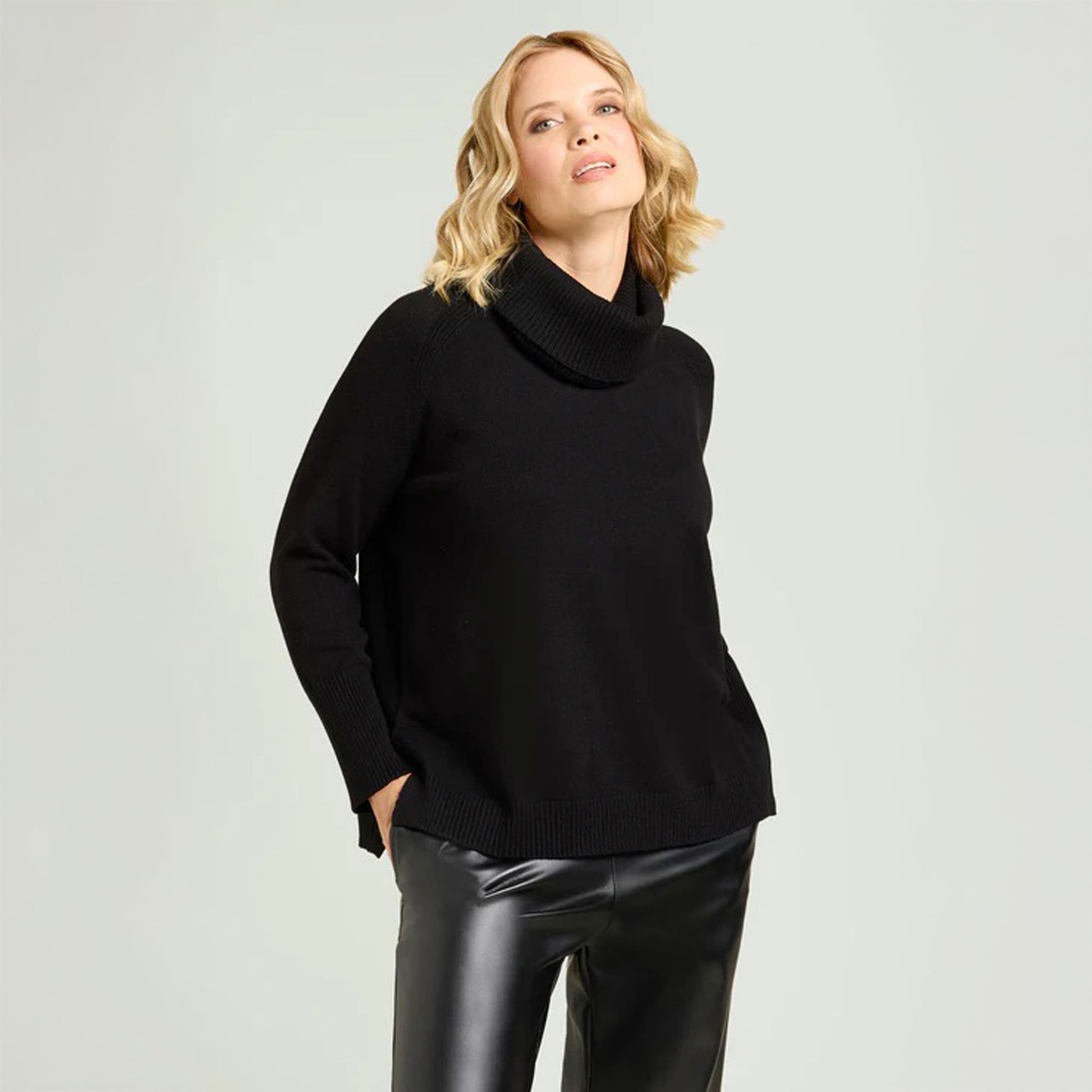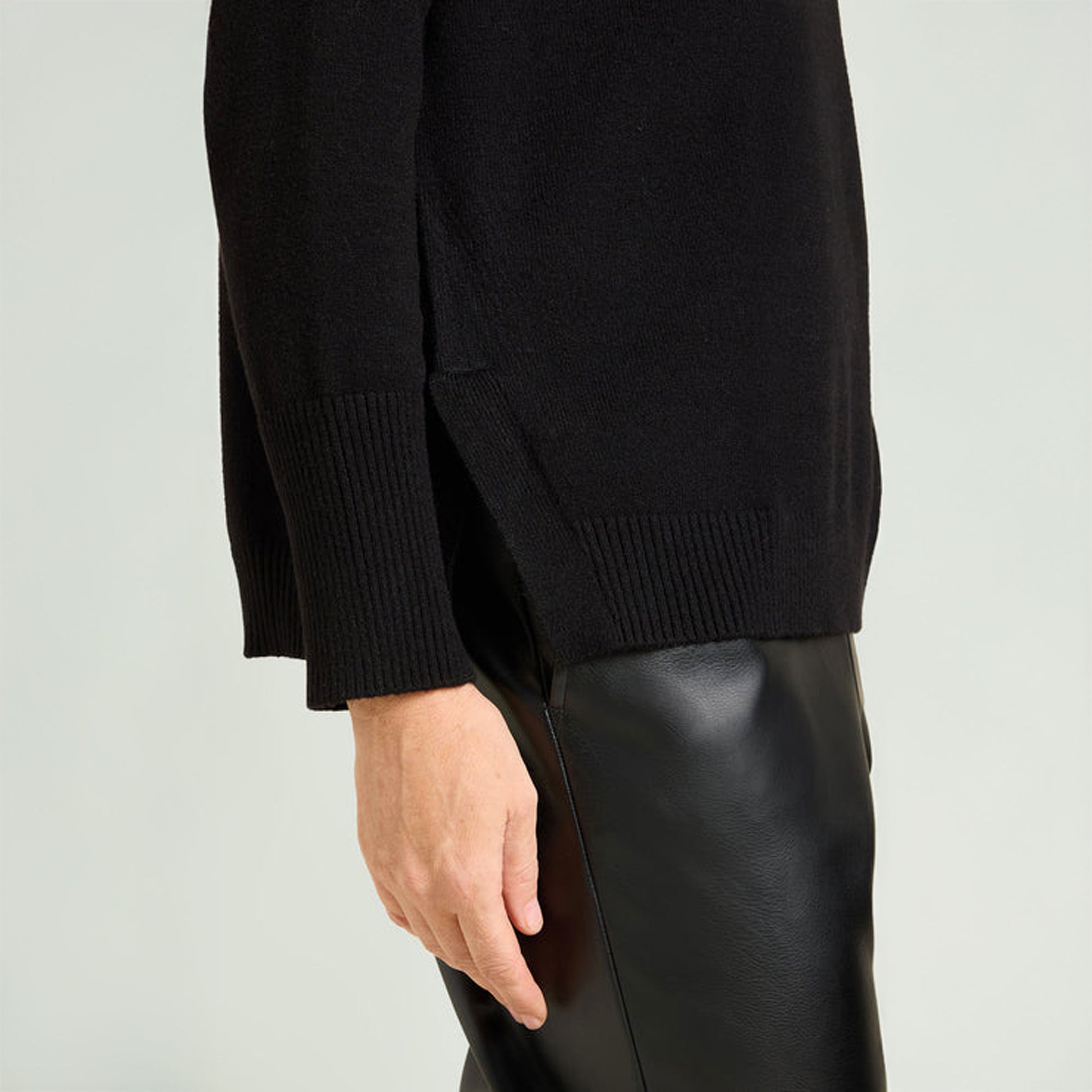 Maglia in viscosa comfort dalla linea comoda con spacchi laterali sovrapposti. Punto rasato in finezza 7 con bordi in costa, taglio raglan con calature, scollatura rotonda e collo ad anello staccabile. Disponibile in nero e in un donante punto di azzurro, perfetto con il jeans.