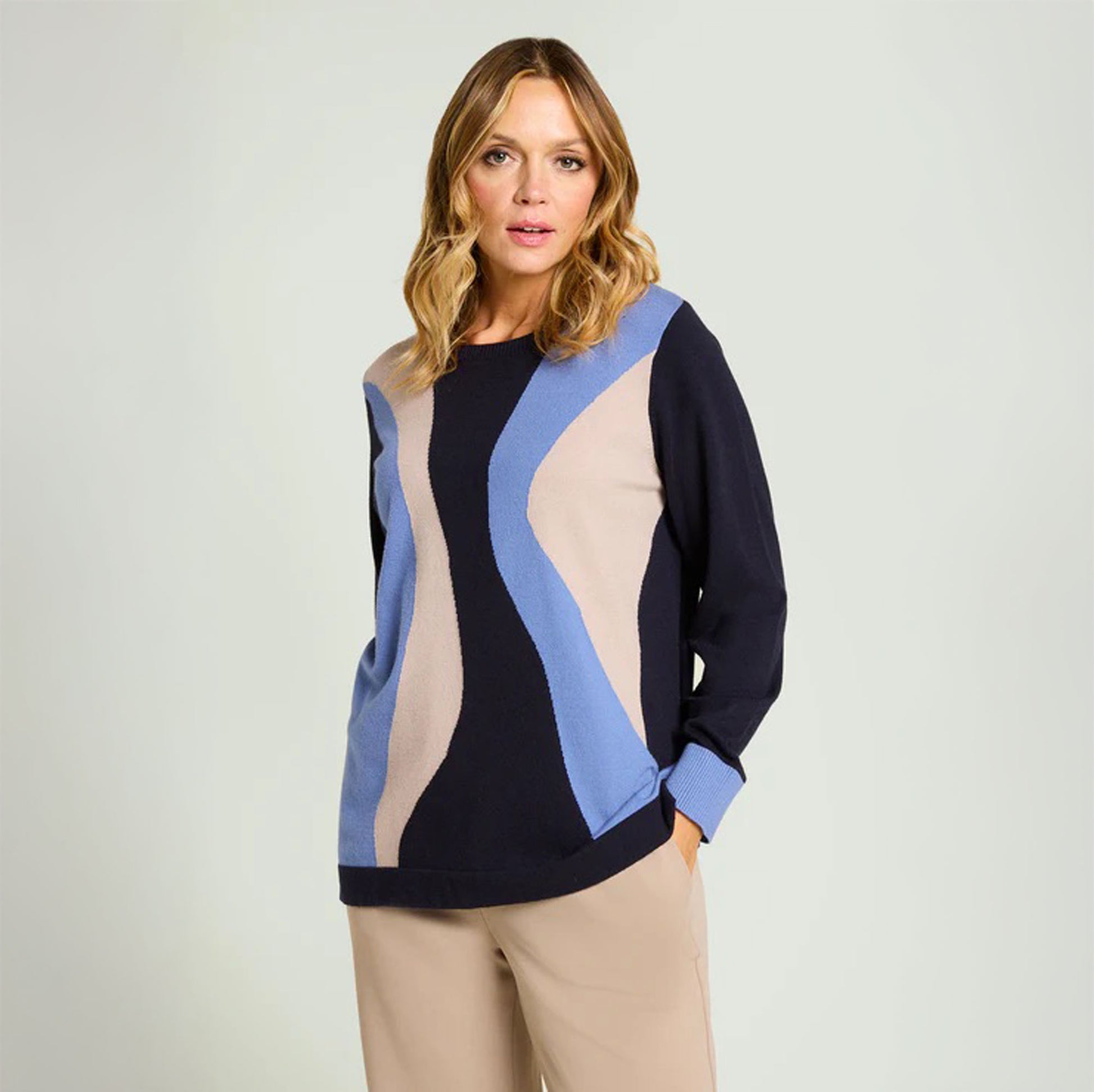 Maglia fantasia in viscosa comfort winter-touch, punto rasato in finezza 12 con bordi in costa, scollatura rotonda. Elaborato intarsio sul davanti con grafica ad onde nei toni blu navy, azzurro e sabbia.
