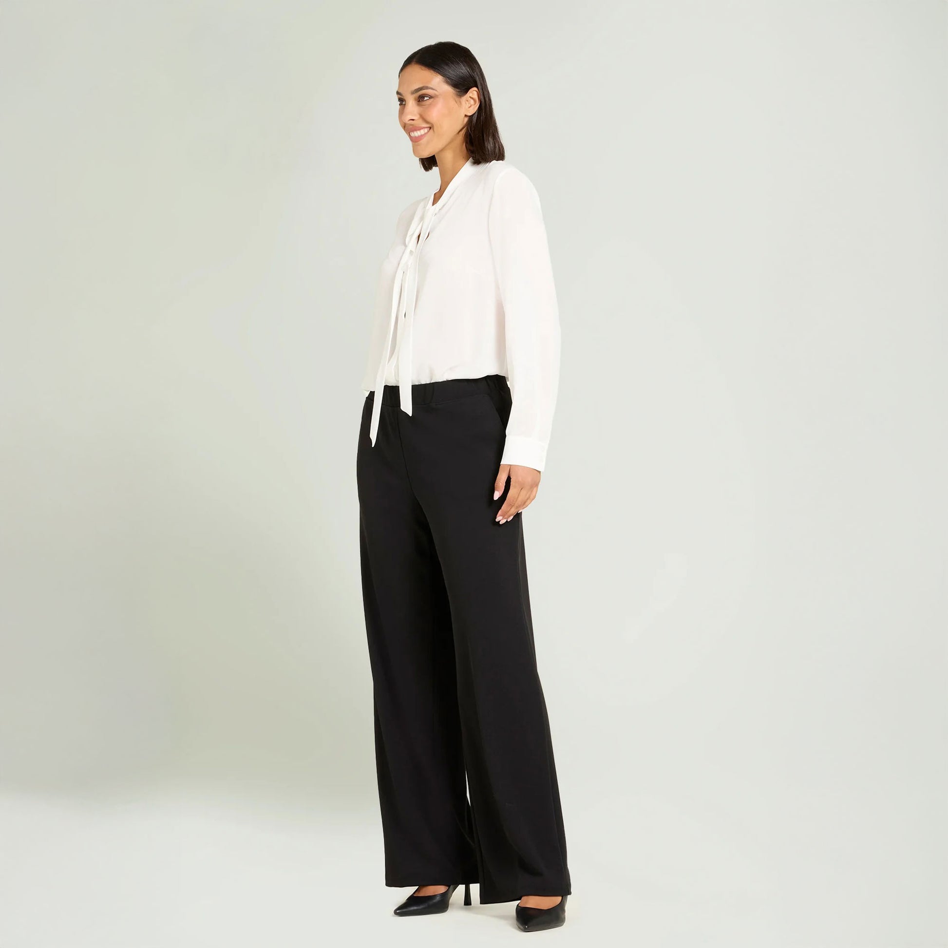 Pantaloni ampi in tessuto super-stretch: uno "scuba crepe" dalla caduta fluida caratterizzato da un rovescio raso che dona una piacevole sensazione sulla pelle. Cintura estensibile con elastico inserito all'interno, tasche all'americana, costruzione Pull-On.
