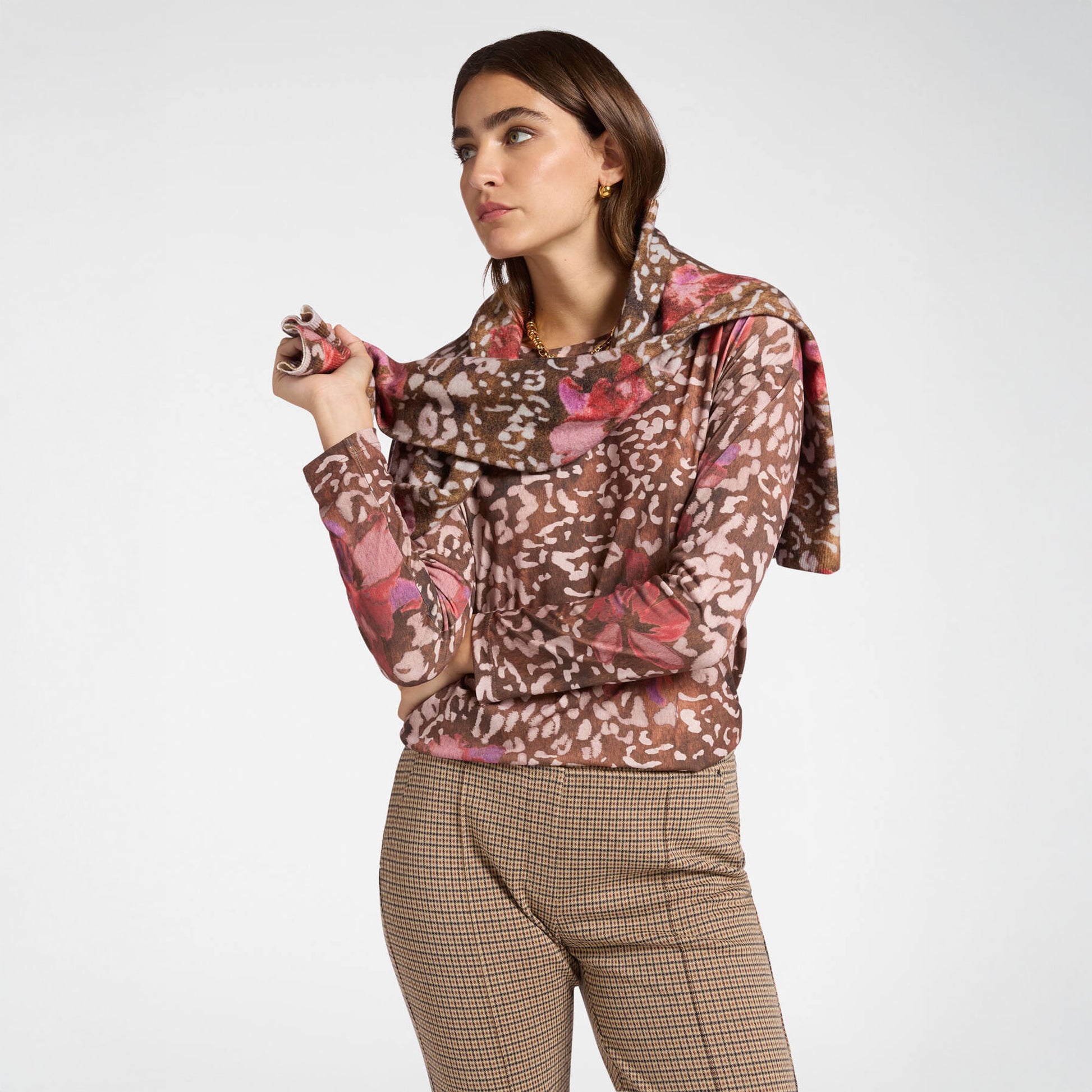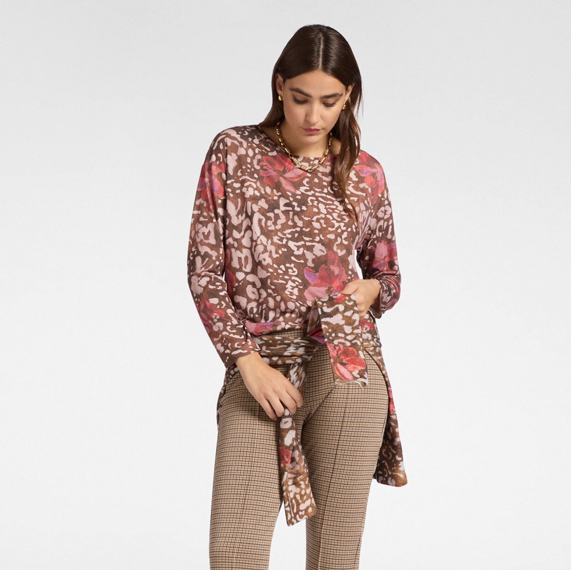 T-shirt stampata, coordinata ai capi di Collezione. Scollo a barchetta e maniche lunghe.