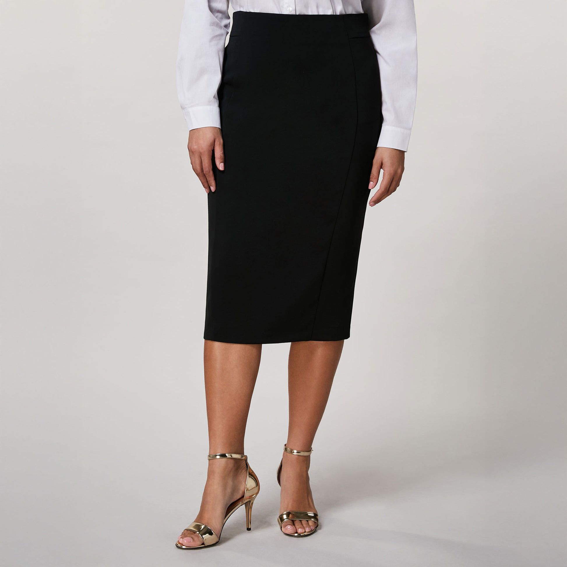Gonna tubino in morbido fluido stretch, foderata con tessuto stretch. Vita leggermente alta, spacco sul retro, chiusura con cerniera lampo. Lunghezza 70 cm. Linea aderente, con gioco di tagli verticali che definisce la silhouette. Un capo che unisce semplicità e stile