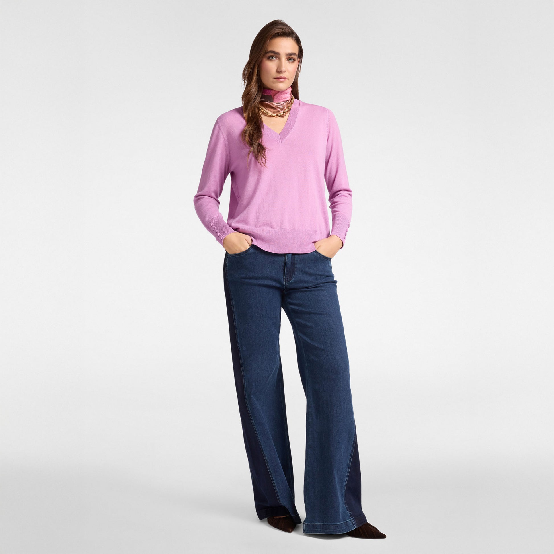 Maglia realizzata in preziosa lana leggera soft touch con bordi in viscosa lucida a coste