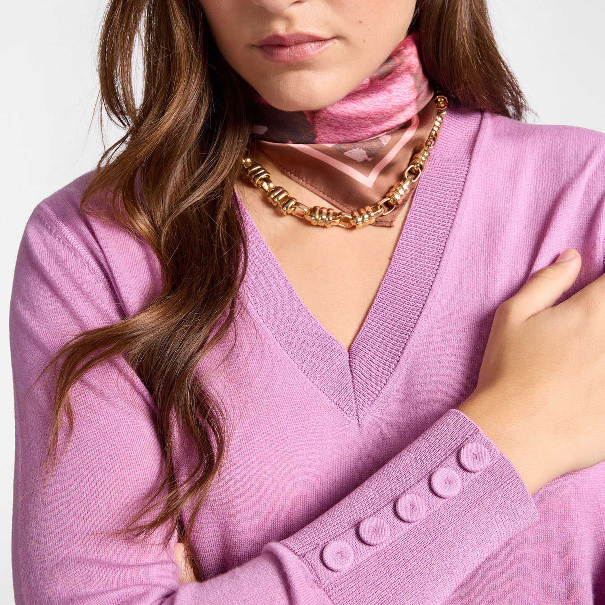 Scollo a V femminile, linea basic diritta, polsi a coste con bottoni foderati in viscosa