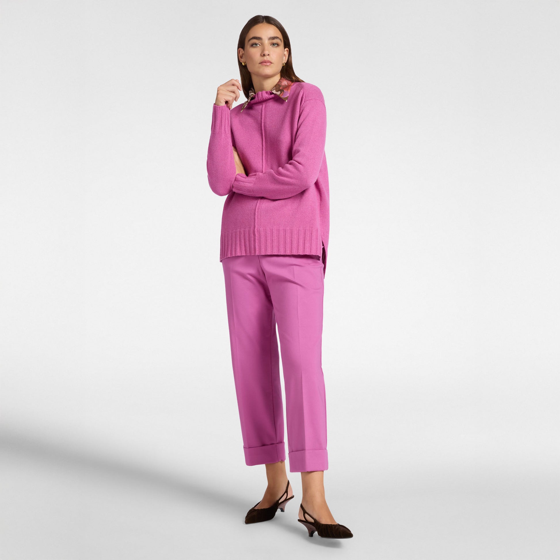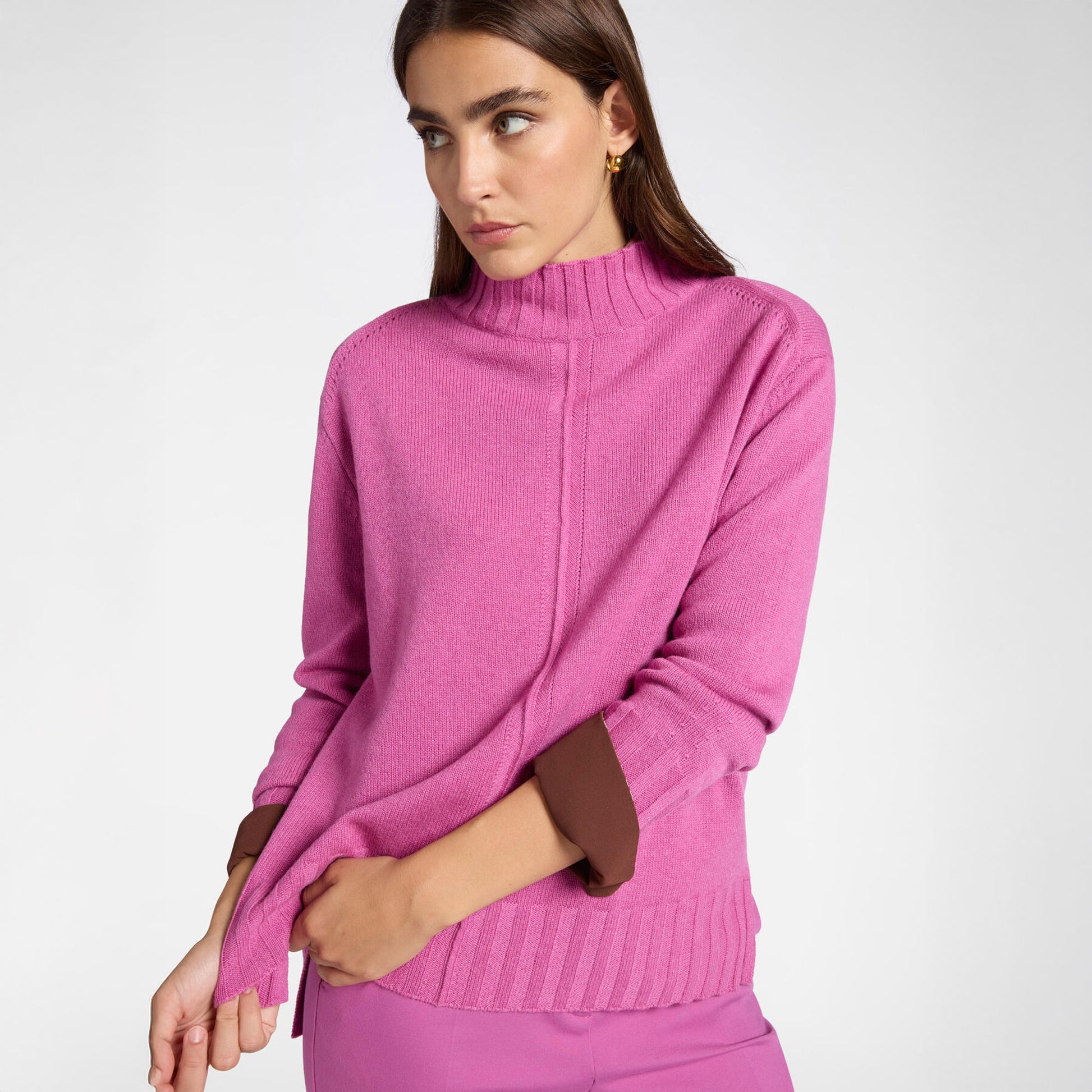 Maglia realizzata in pura lana cardata. Collo montante lavorato a coste, bordo centrale lungo il davanti. Sofisticata e confortevole