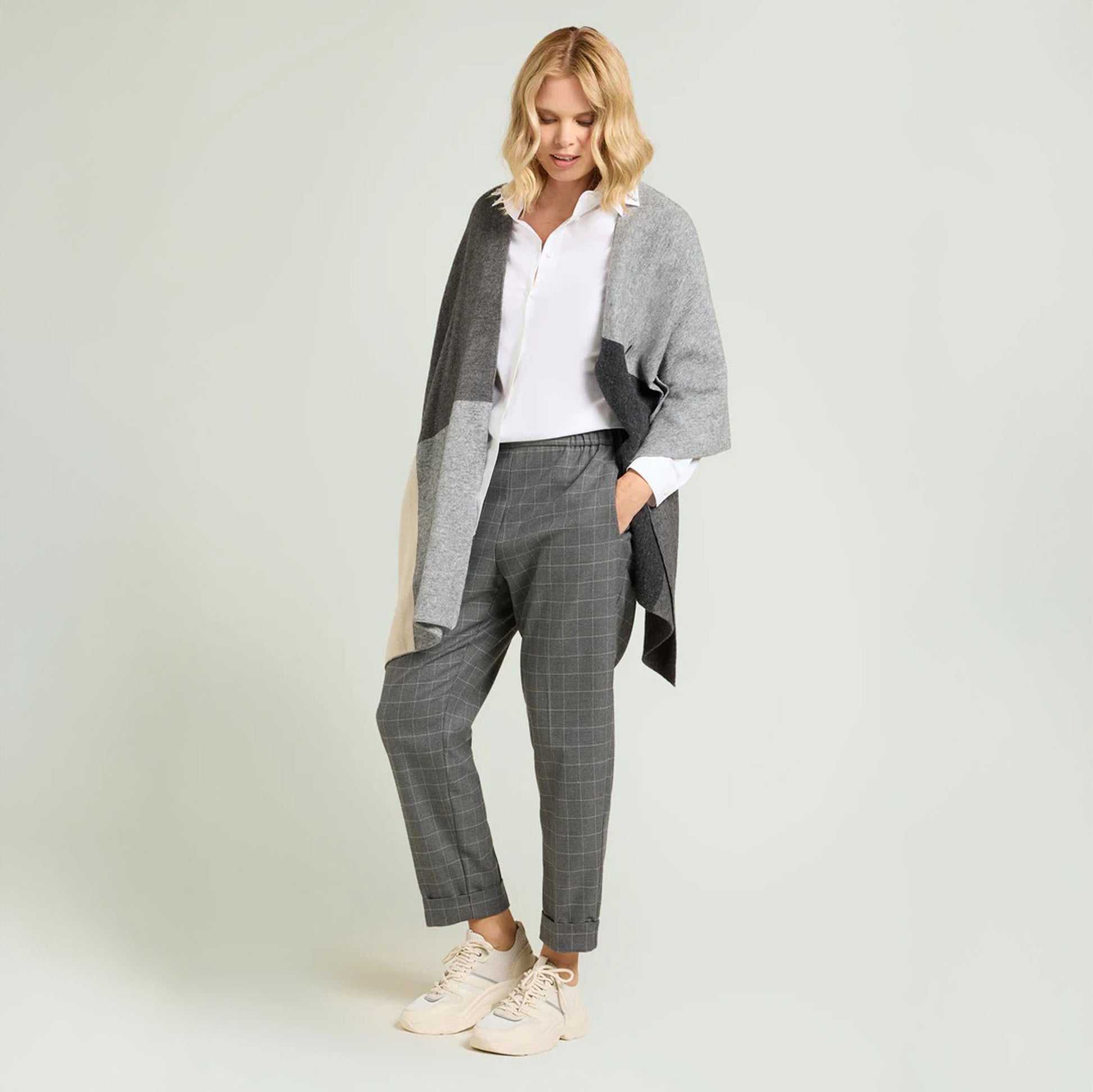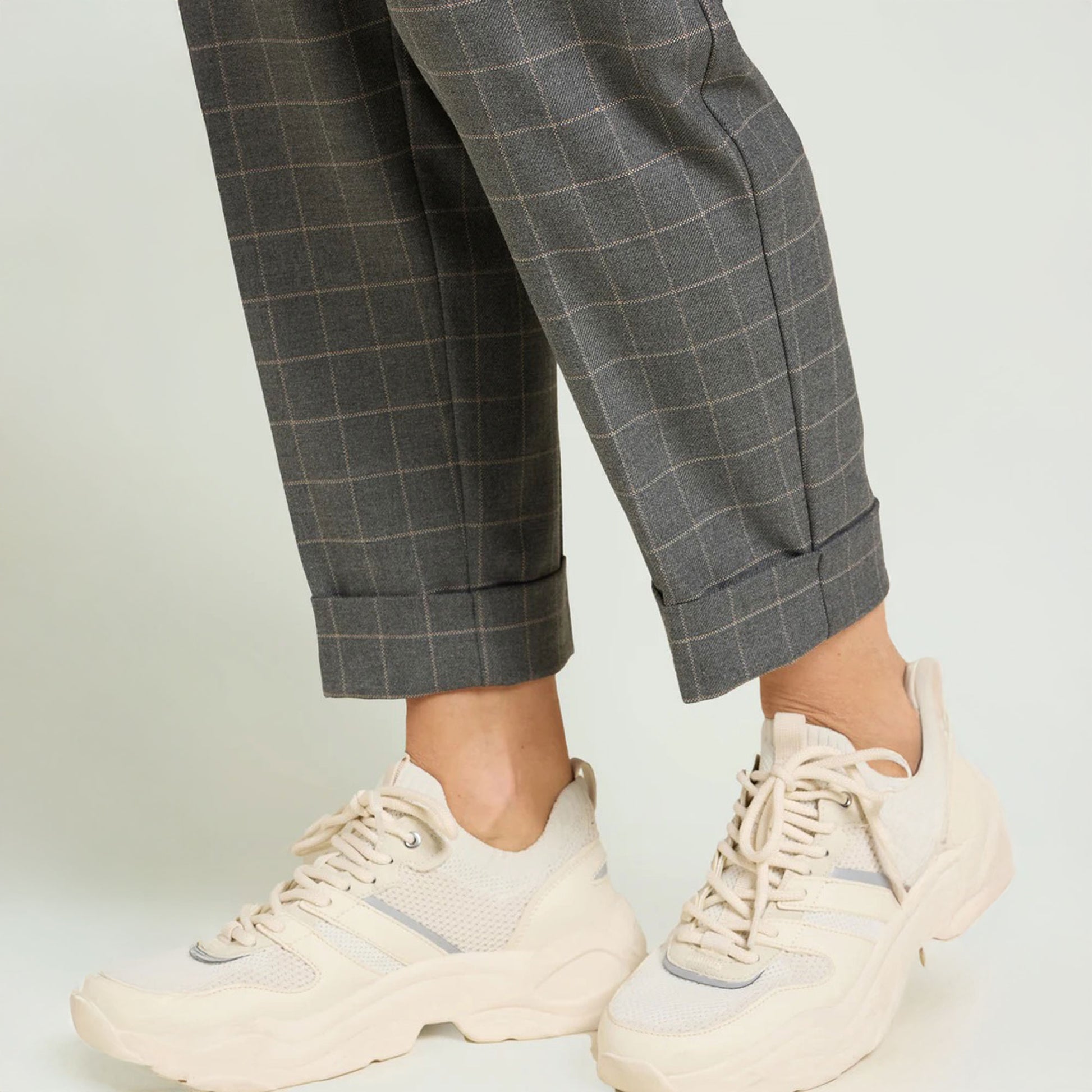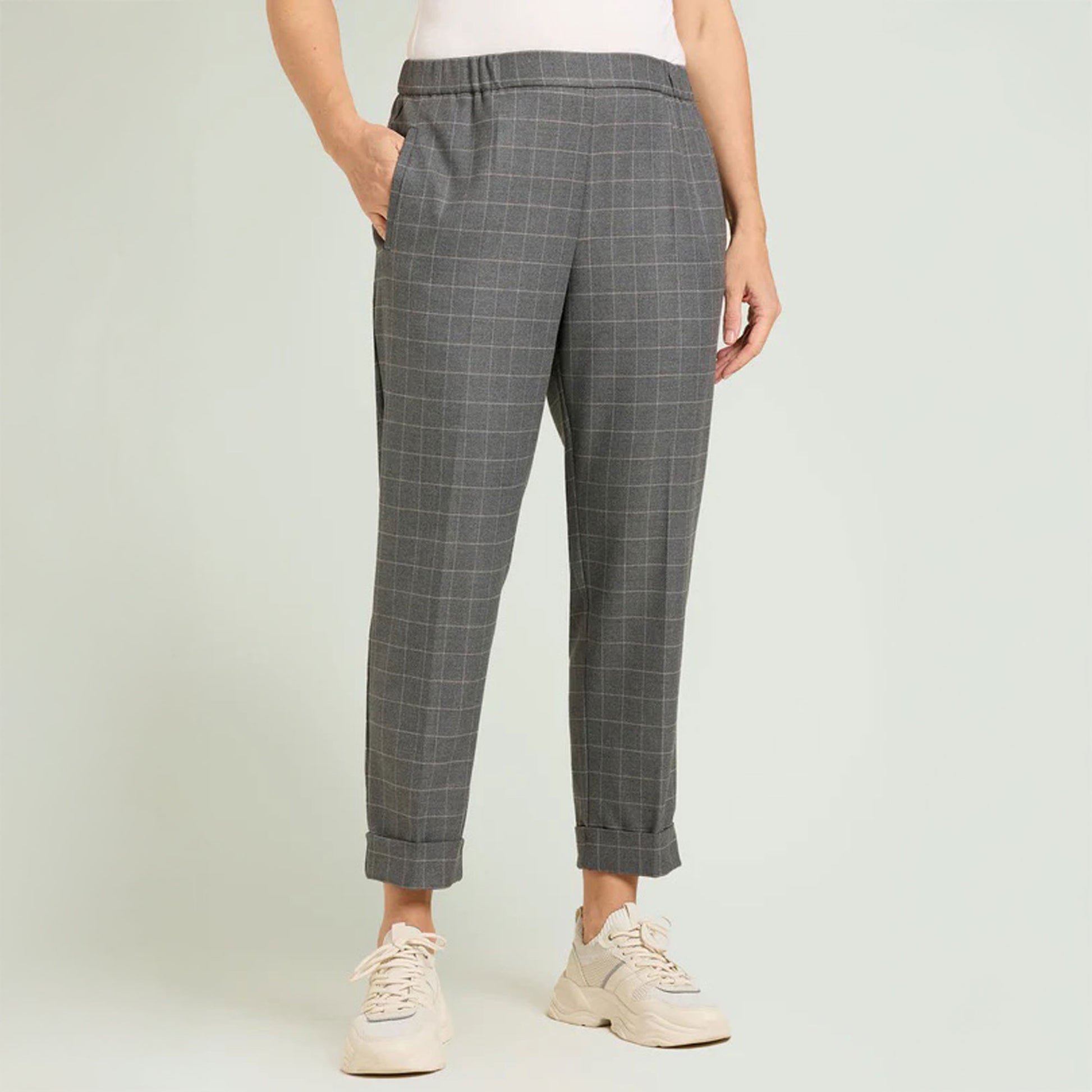 Pantaloni chinos in fantasia check. Punto vita regolare, cintura estensibile con gros-grain elastico inserito nel tratto dietro, tasche a filetto, risvolto, piega stirata. Tessuto comfort, costruzione Pull-On.